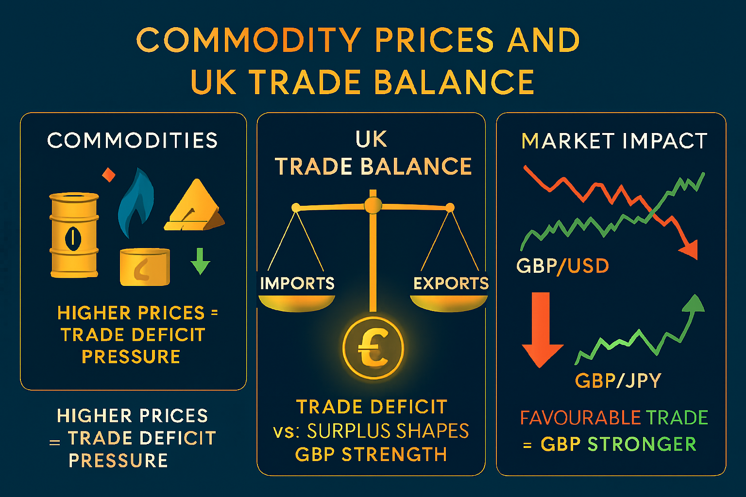 As an import-heavy nation, the UK’s trade balance is sensitive to commodity price shifts. Elevated oil and energy prices can widen trade deficits, putting downward pressure on GBP. In contrast, favourable trade conditions may provide upside momentum.