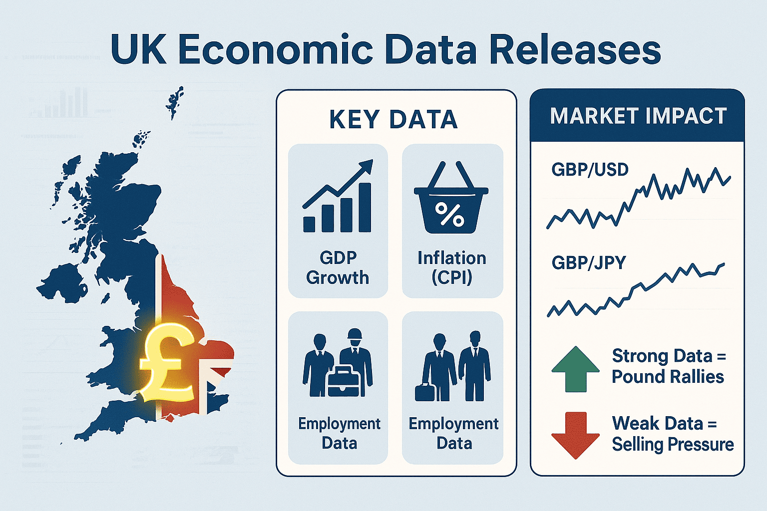 Key reports such as GDP growth, inflation (CPI), and employment data are critical for GBP volatility. In 2025, market participants are particularly attentive to how the UK economy manages sluggish growth in the face of global headwinds. Strong data could fuel pound rallies, while weaker-than-expected releases may lead to selling pressure across GBP pairs.