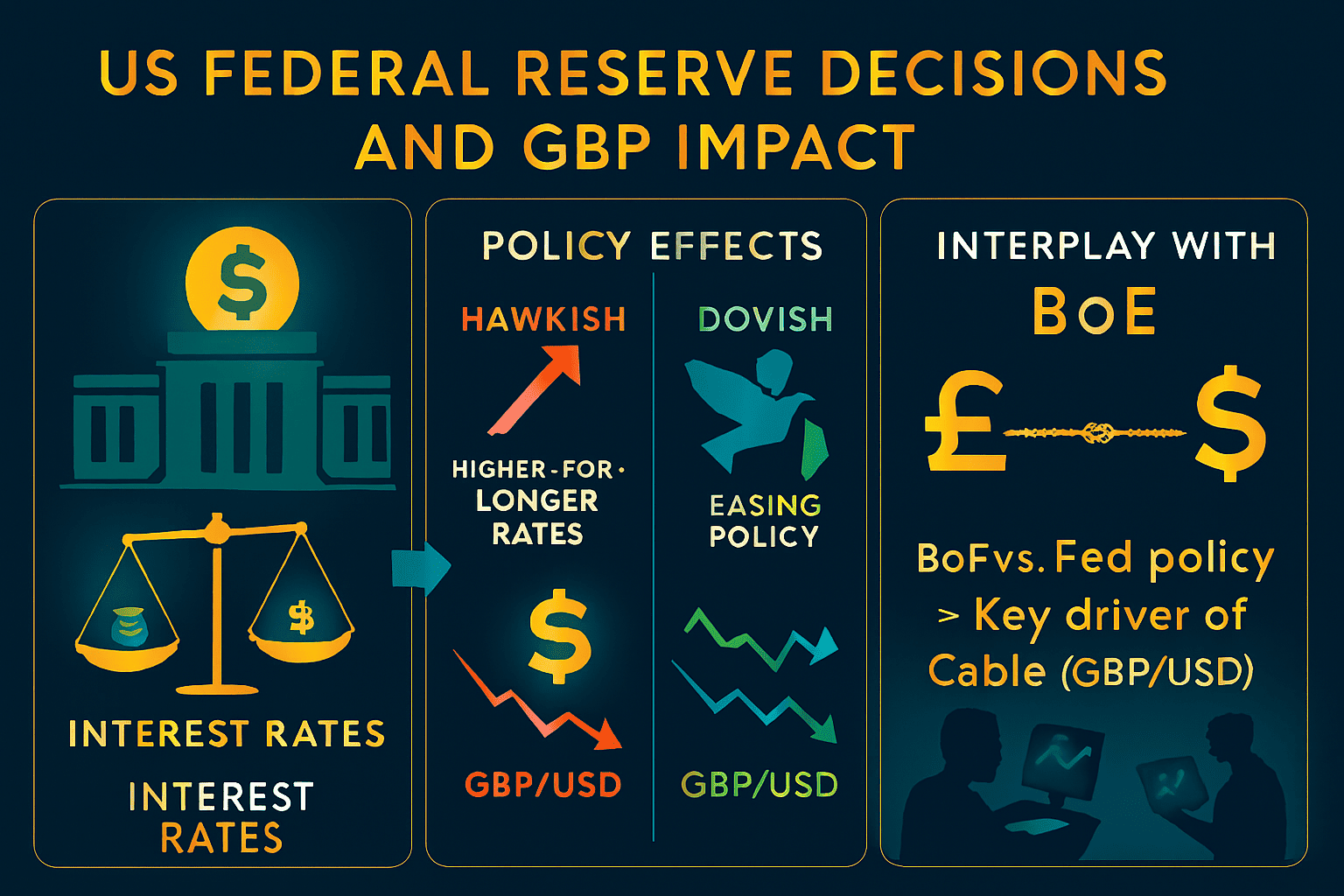 The Fed’s policy moves ripple through every major currency, including the pound. When the Fed signals higher-for-longer interest rates, the USD strengthens, often pushing GBP/USD lower. Conversely, if the Fed adopts a more dovish tone, the dollar may weaken, allowing GBP to gain ground. The interplay between BoE and Fed policy is a major driver of cable’s movements.