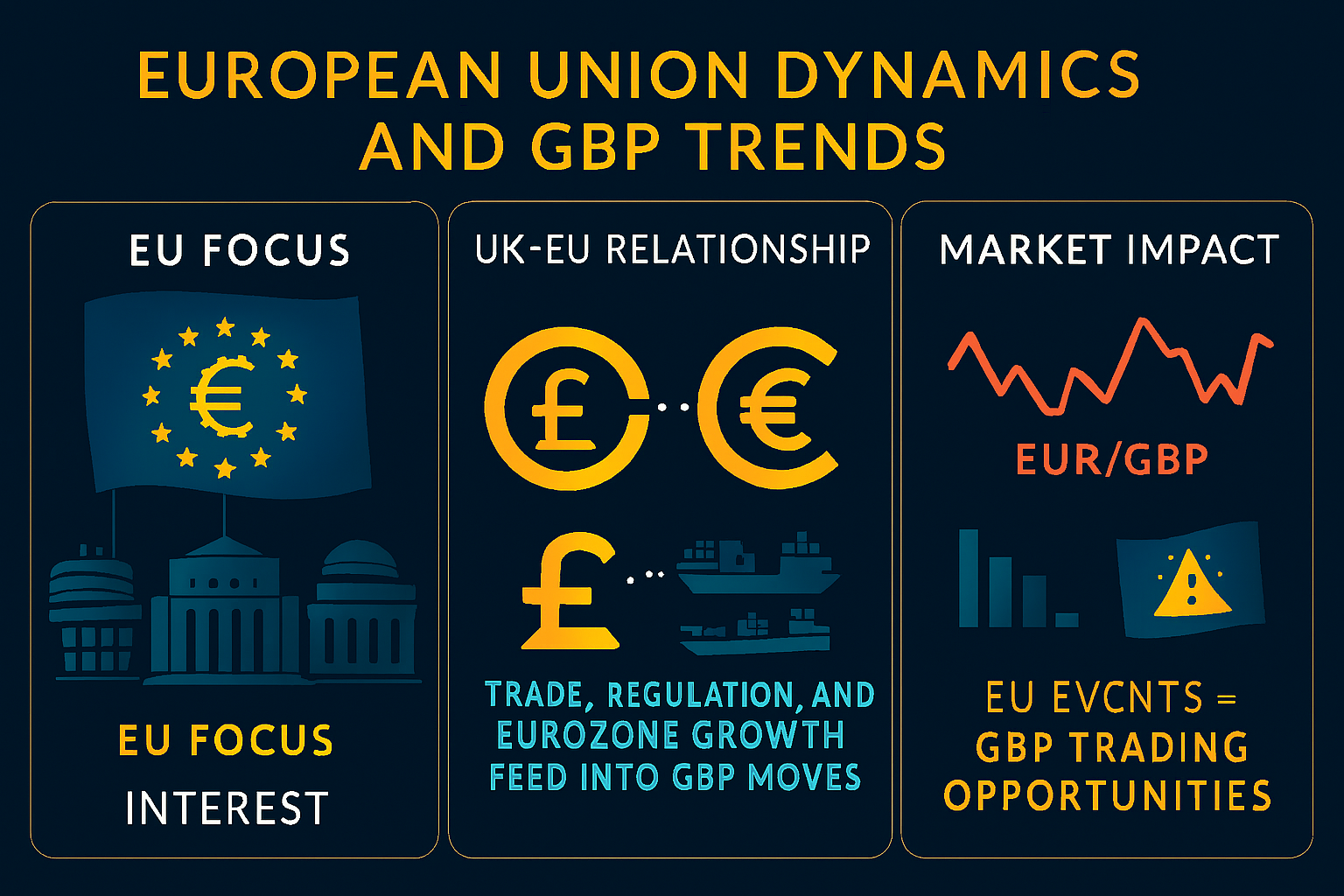 Despite Brexit, the UK’s economic ties with the European Union remain significant. Trade negotiations, regulatory shifts, and eurozone performance can indirectly shape GBP trends. For example, eurozone growth weakness or political instability may cause EUR/GBP volatility, offering trading opportunities.
