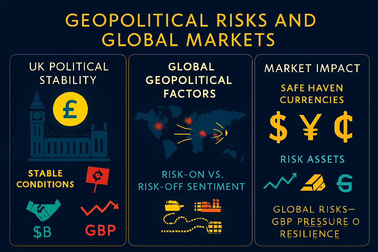 Geopolitical developments from UK political stability to global conflicts can create risk-off or risk-on scenarios that impact GBP. In times of uncertainty, investors may seek safe-haven assets like the USD or JPY, which can weigh on the pound. On the other hand, stable political conditions in the UK can enhance investor confidence, supporting GBP resilience.